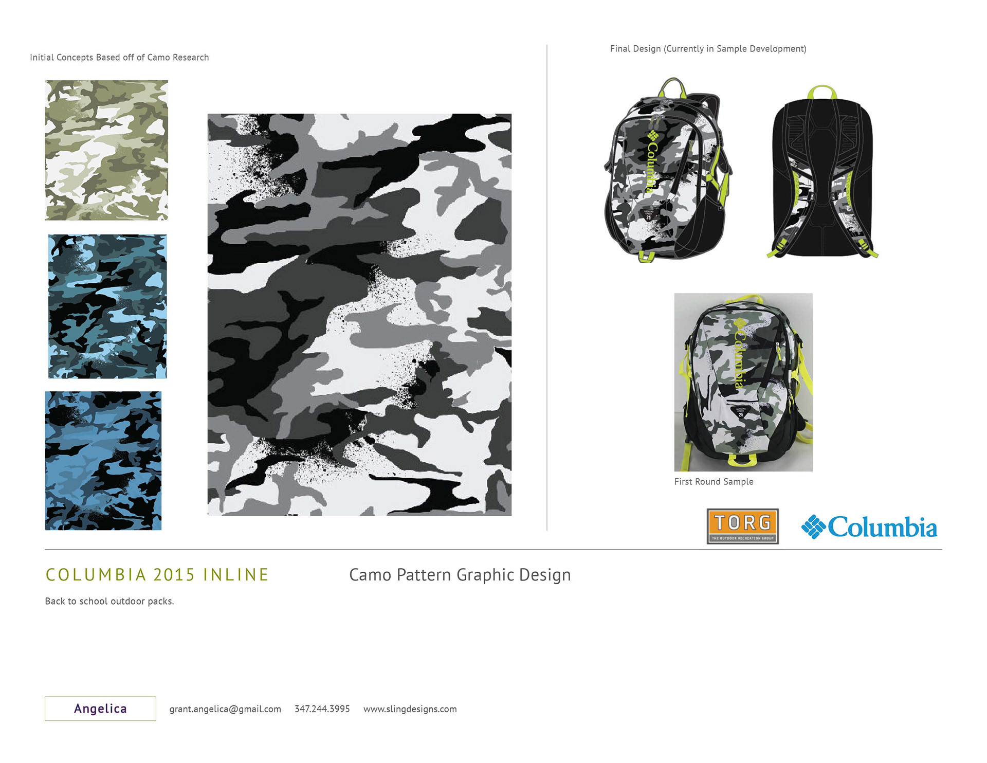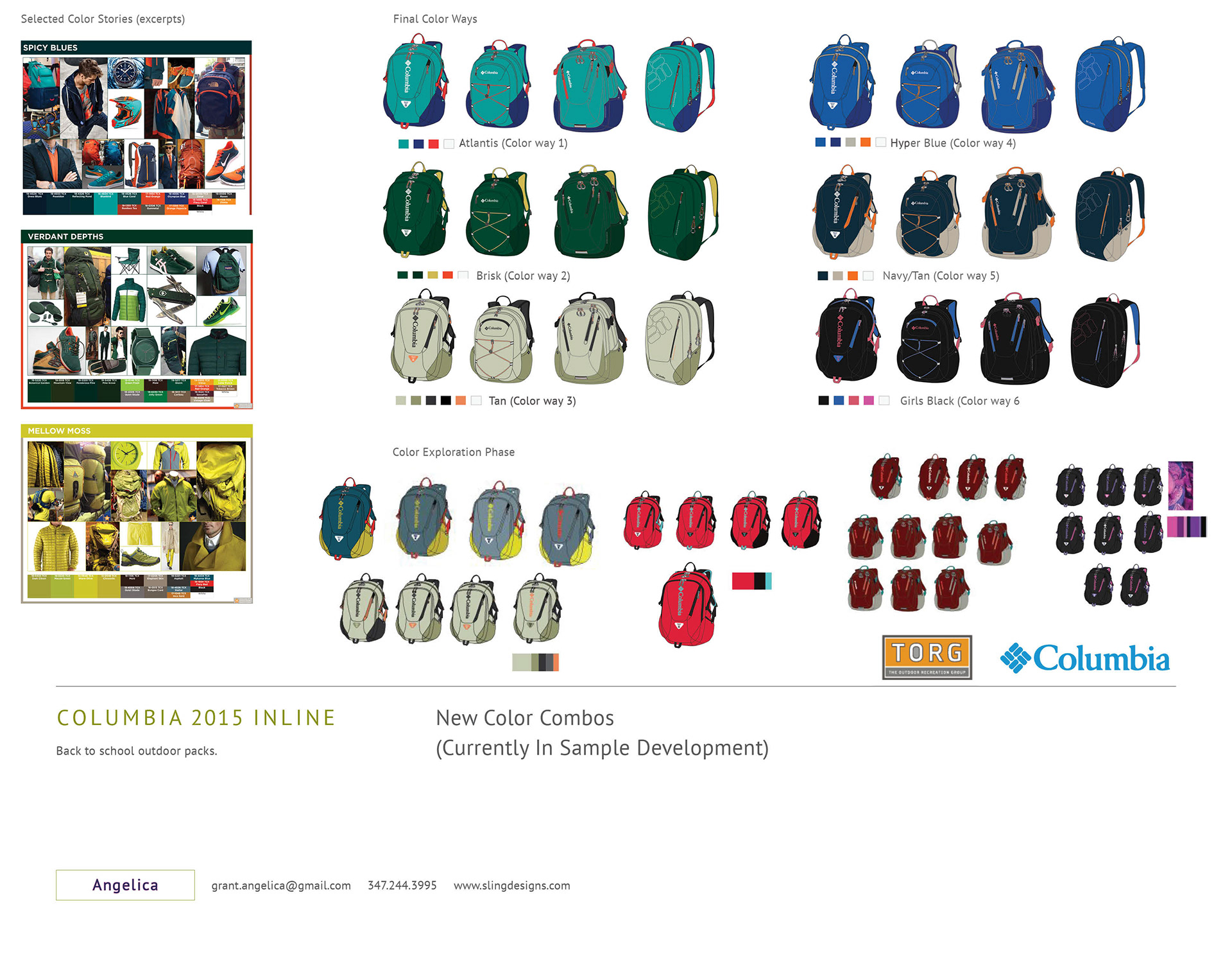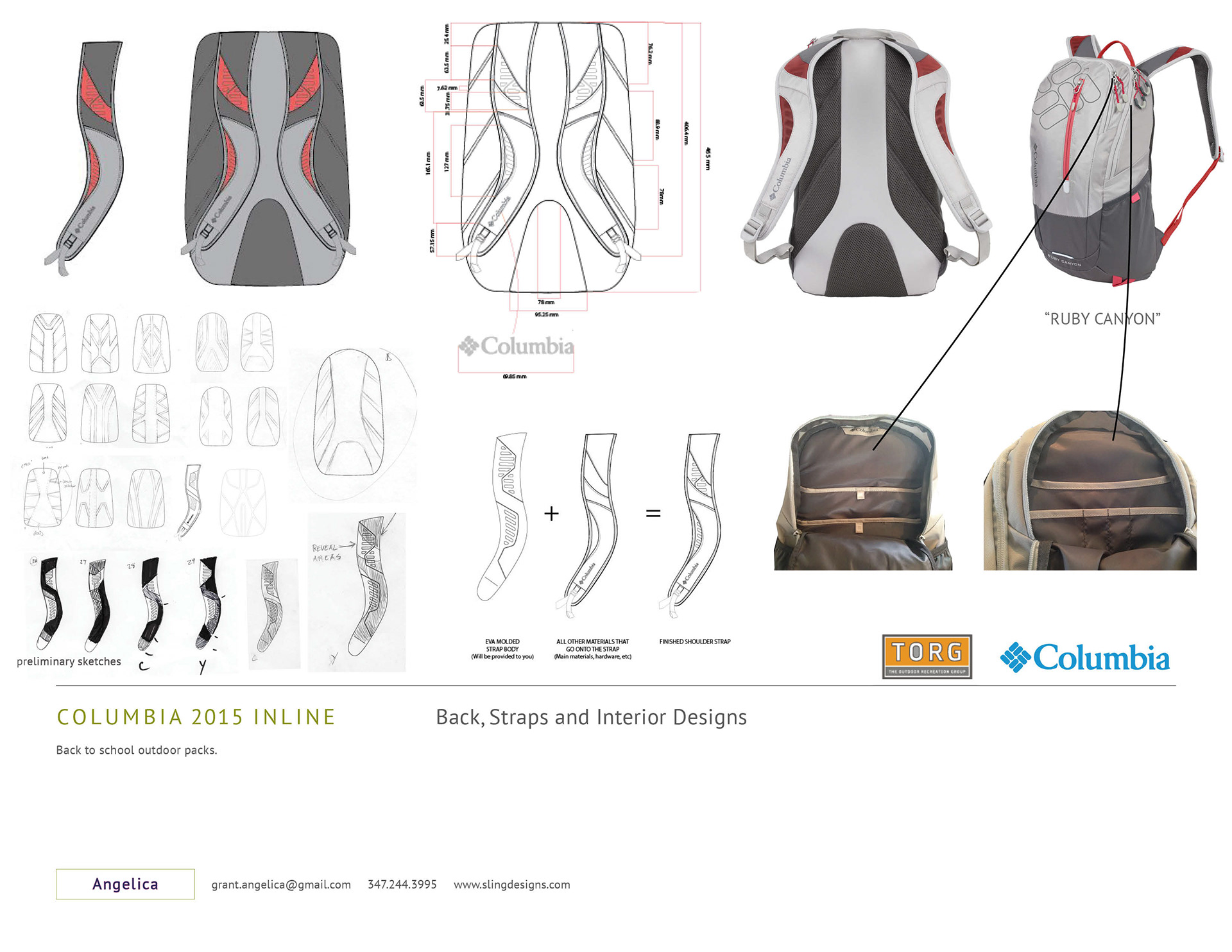 Designed the features, back, straps, interiors and new color ways for the Columbia inline 2015 collection. Worked through the entire process from design concepts through to production. Presented and designed for Columbia's BTS 2015 collection. The intent is to design and develop outdoor packs.