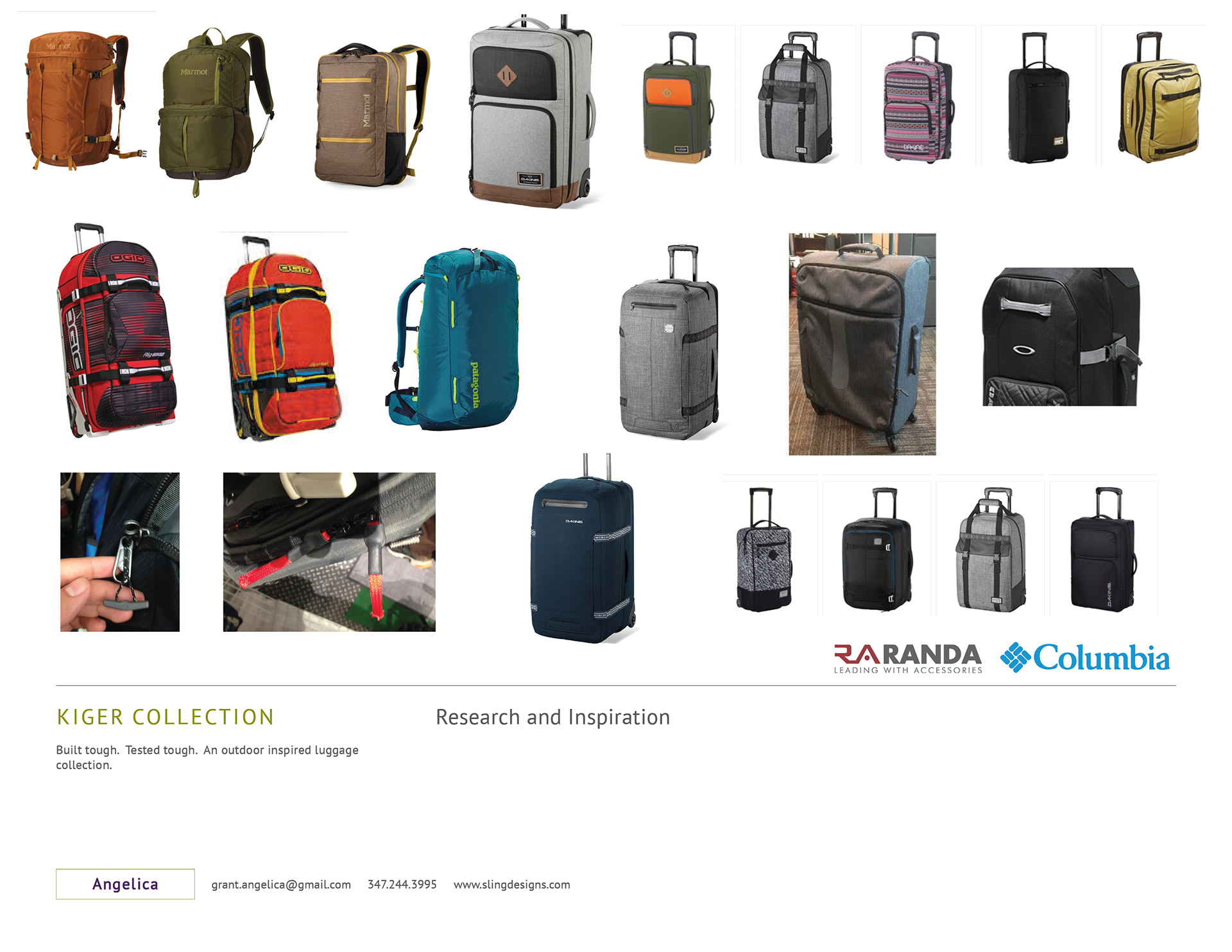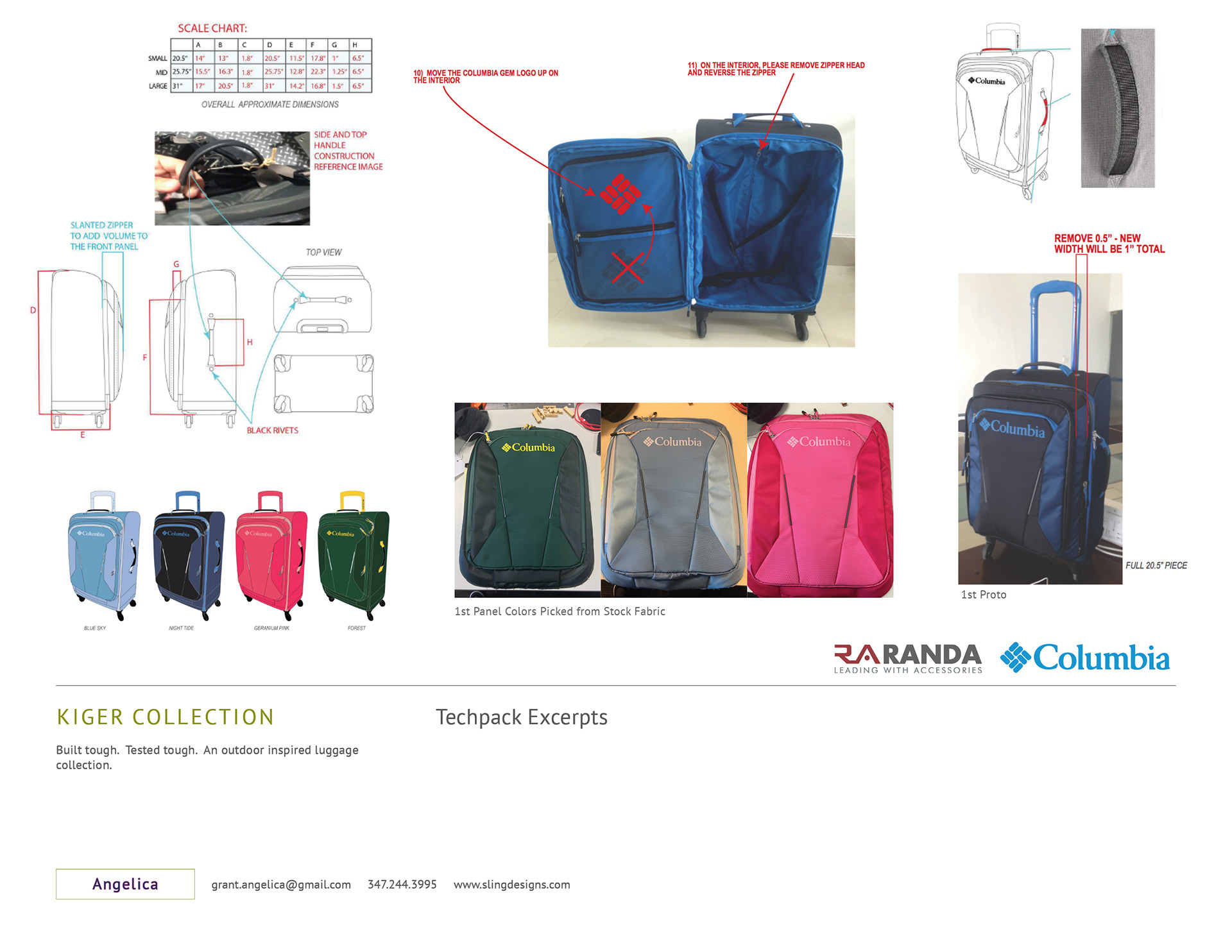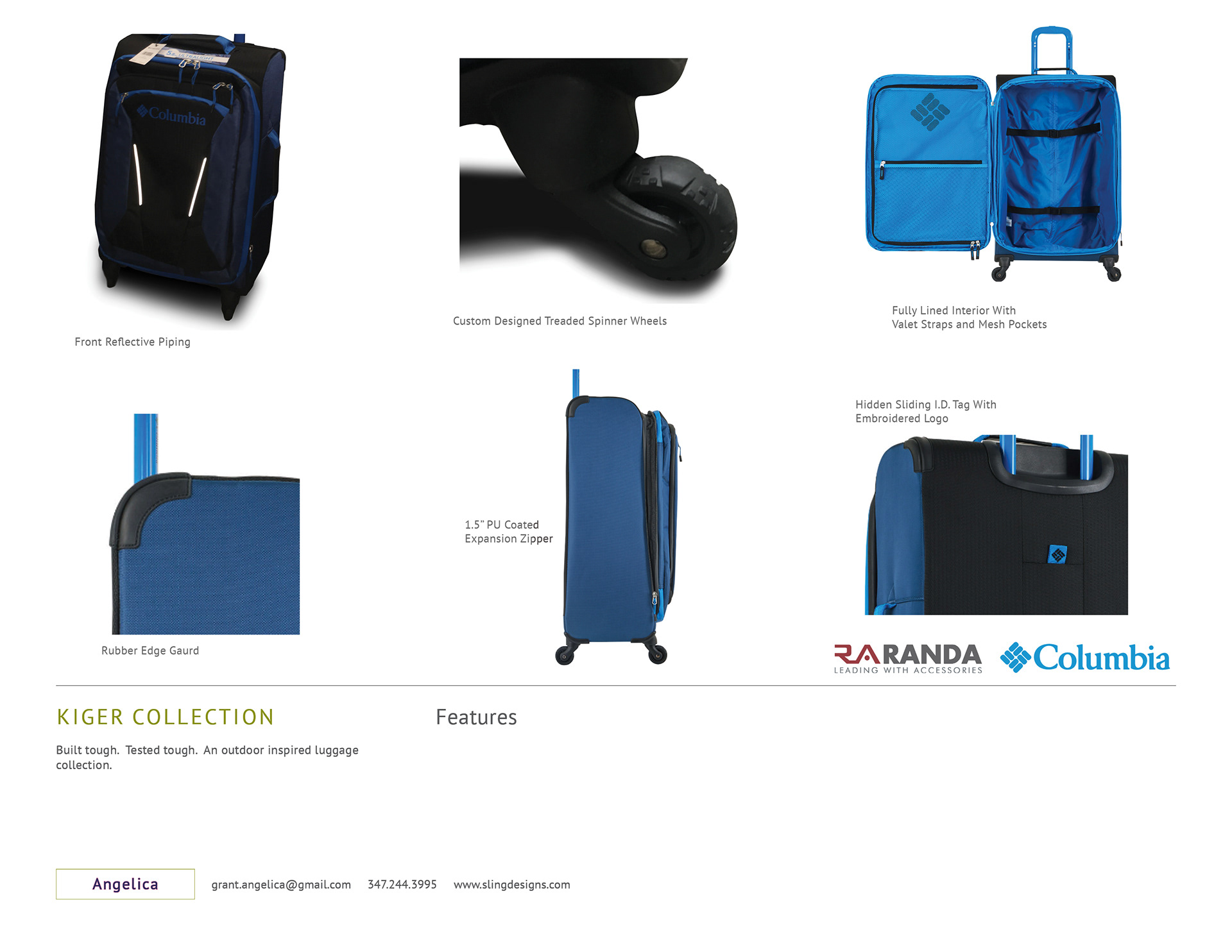 Designed and developed the Columbia Kiger luggage collection. Built tough and designed around function. This custom design features reflective front piping, water resistant zippers, treaded spinner wheels and has rubberized edge bumper guards. Sold in JCP, Kohls, Amazon and other major retailers and eCommerce stores.