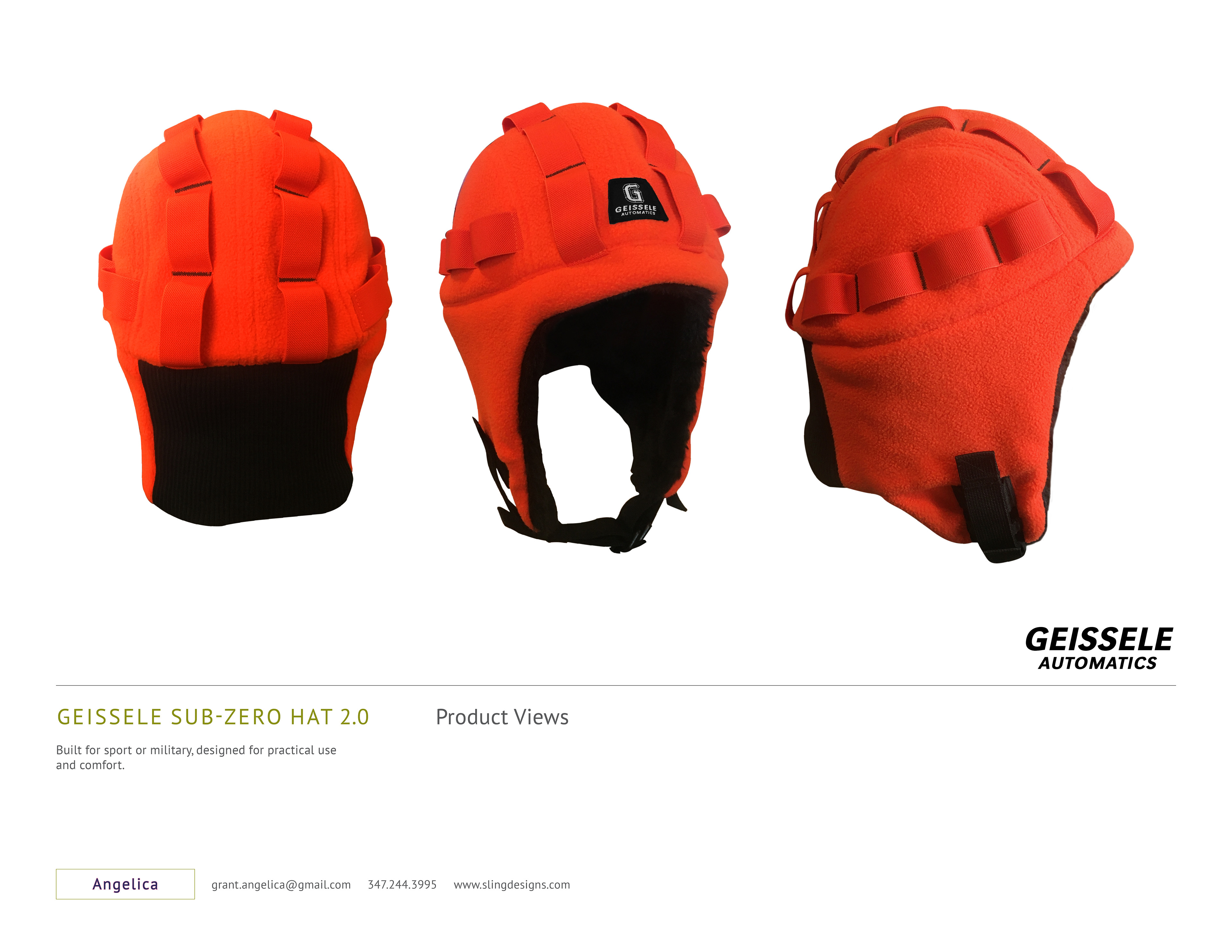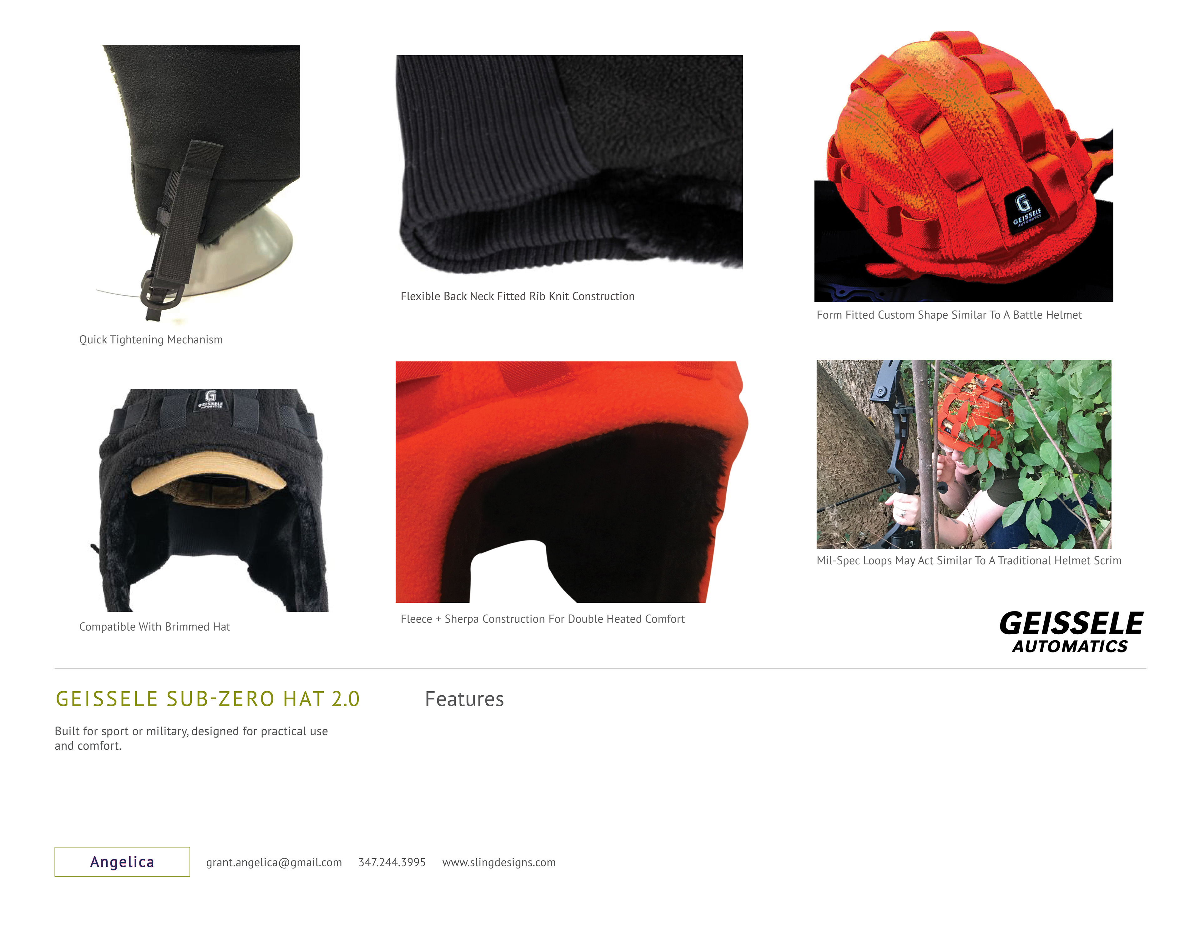The intent for the Super Sub-Zero Hat 2.0 is to fully cover all parts of the head from the back of the neck and up while leaving no room for cold air to enter. It features exterior head loops to slide brush underneath securely. With a military construction it can be used with other head caps and equipment. Sturdy and well constructed for very active use (OSFA). Planned and executed the design, factory sourcing, costing, fabrics, colors, construction and logistics.