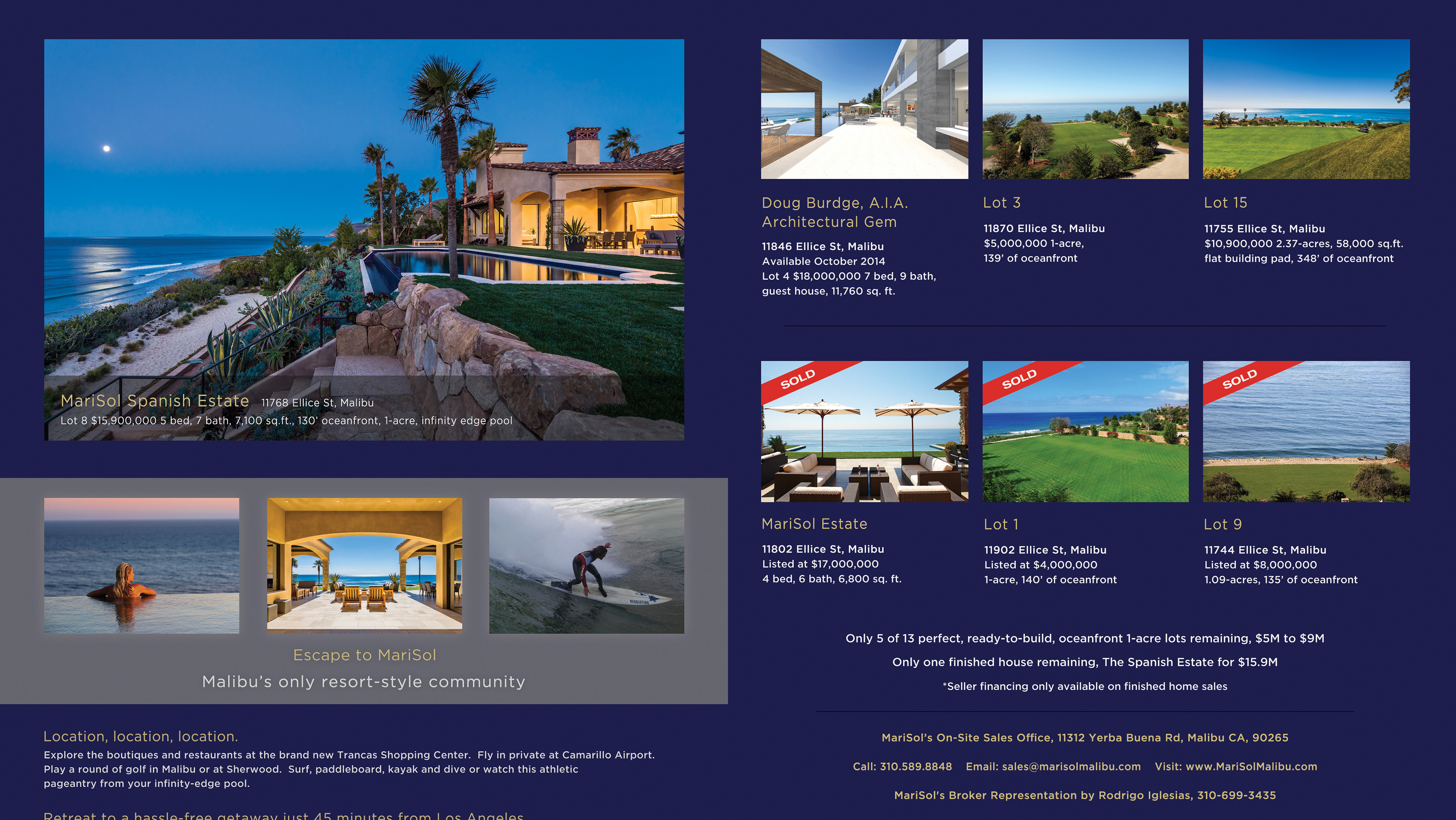Marketing properties to high net worth individuals. Projects consisted of print and web based work. Created magazine ads for the Homes and Land magazine distributed throughout Malibu, CA. Designed post cards, flyers, stickers, 3D statue concept, brochures and inserts.