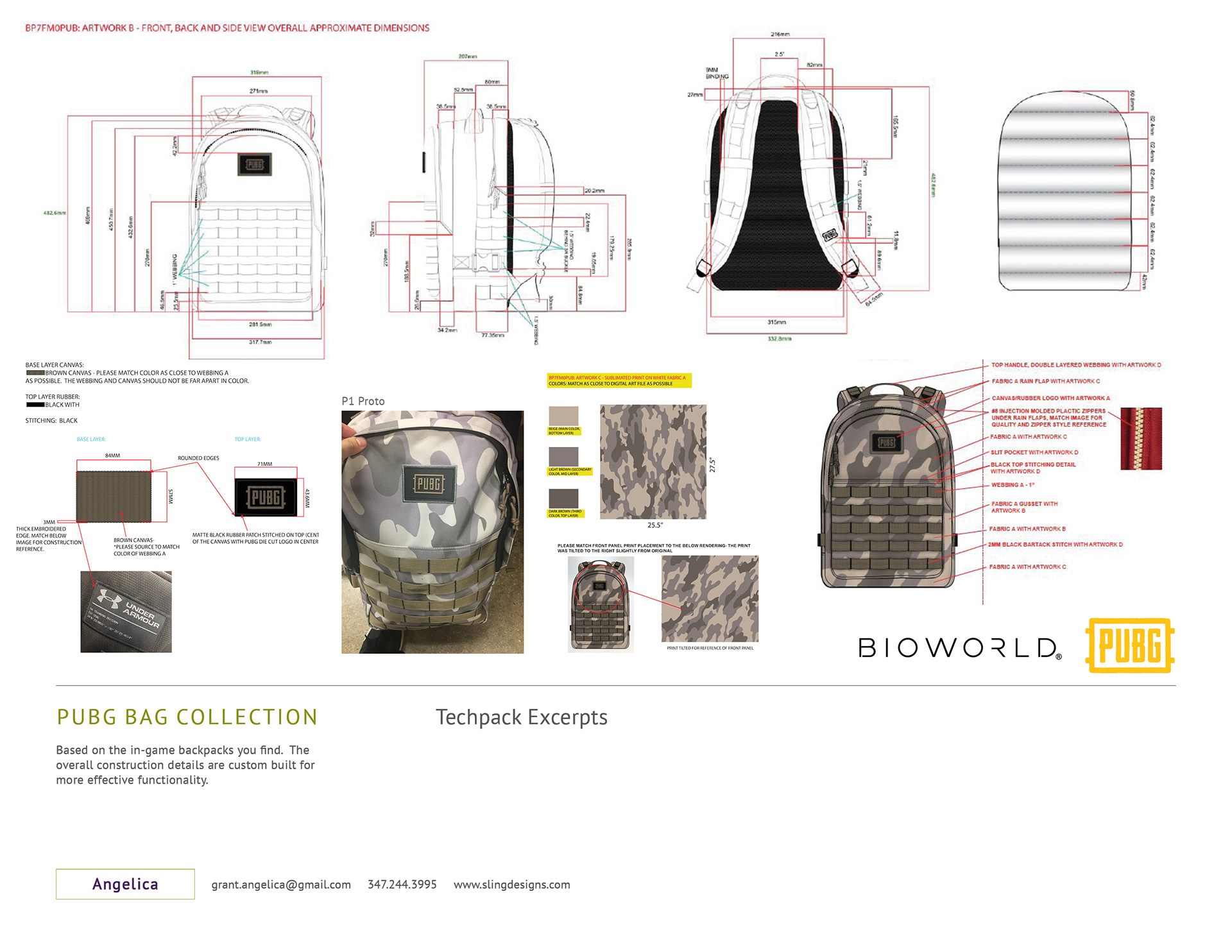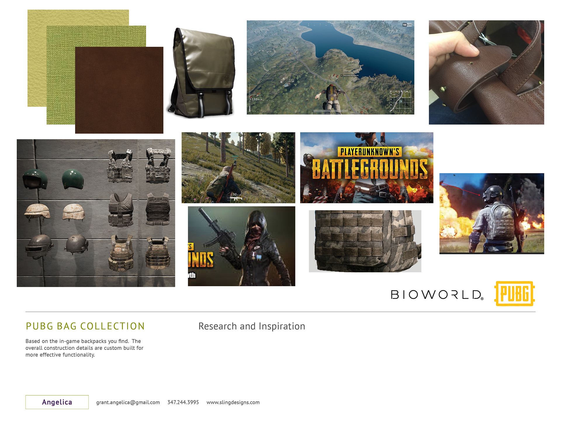 PlayerUnknown’s Battlegrounds (PUBG) bag collection. Designed to be identical to the in-game bags but with detailed functionality and construction for the everyday fan consumer. A separate series of bags with the intent to be different from the in-game bags were also created following the brand identity and aesthetic. The camo print, logos, zippers, hardware and interiors are all custom built.