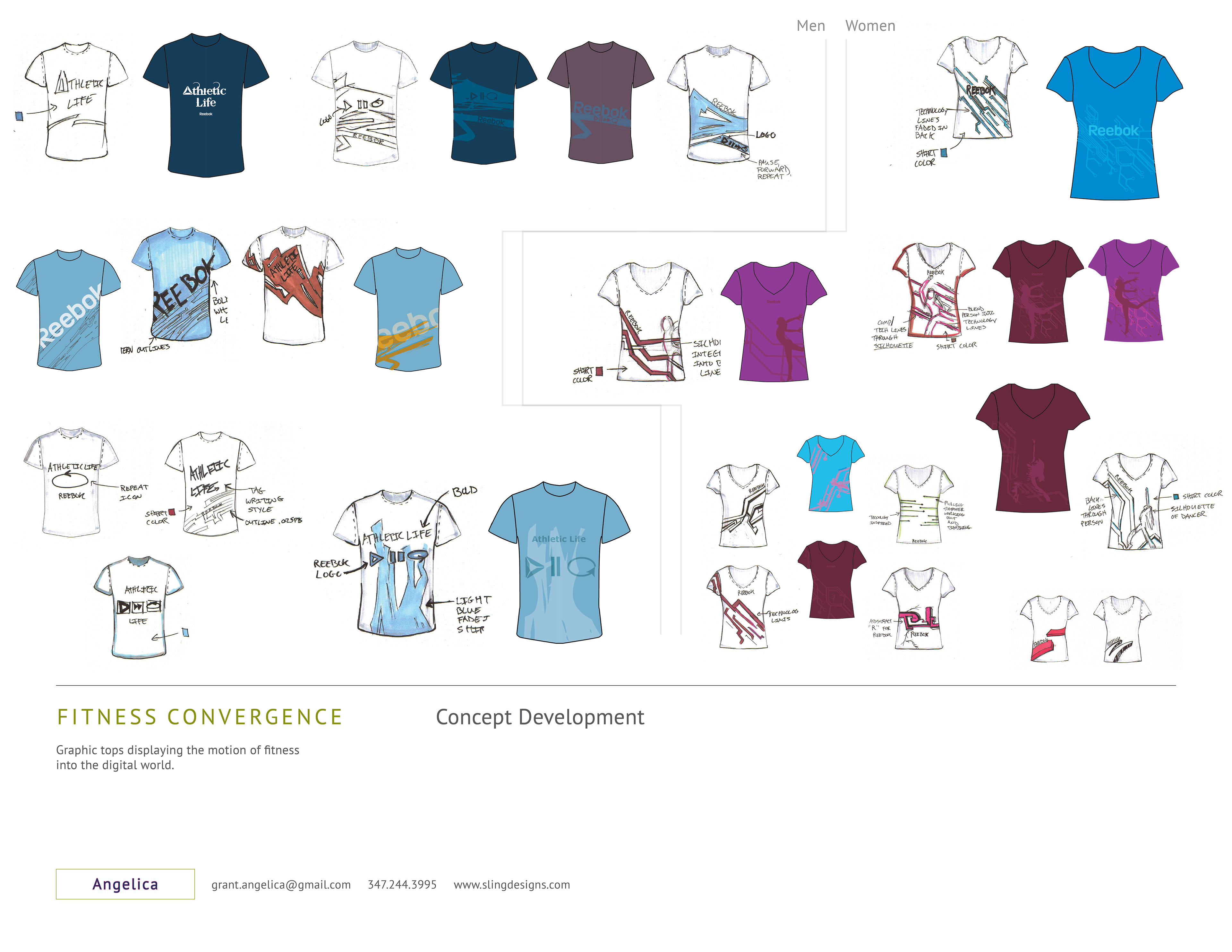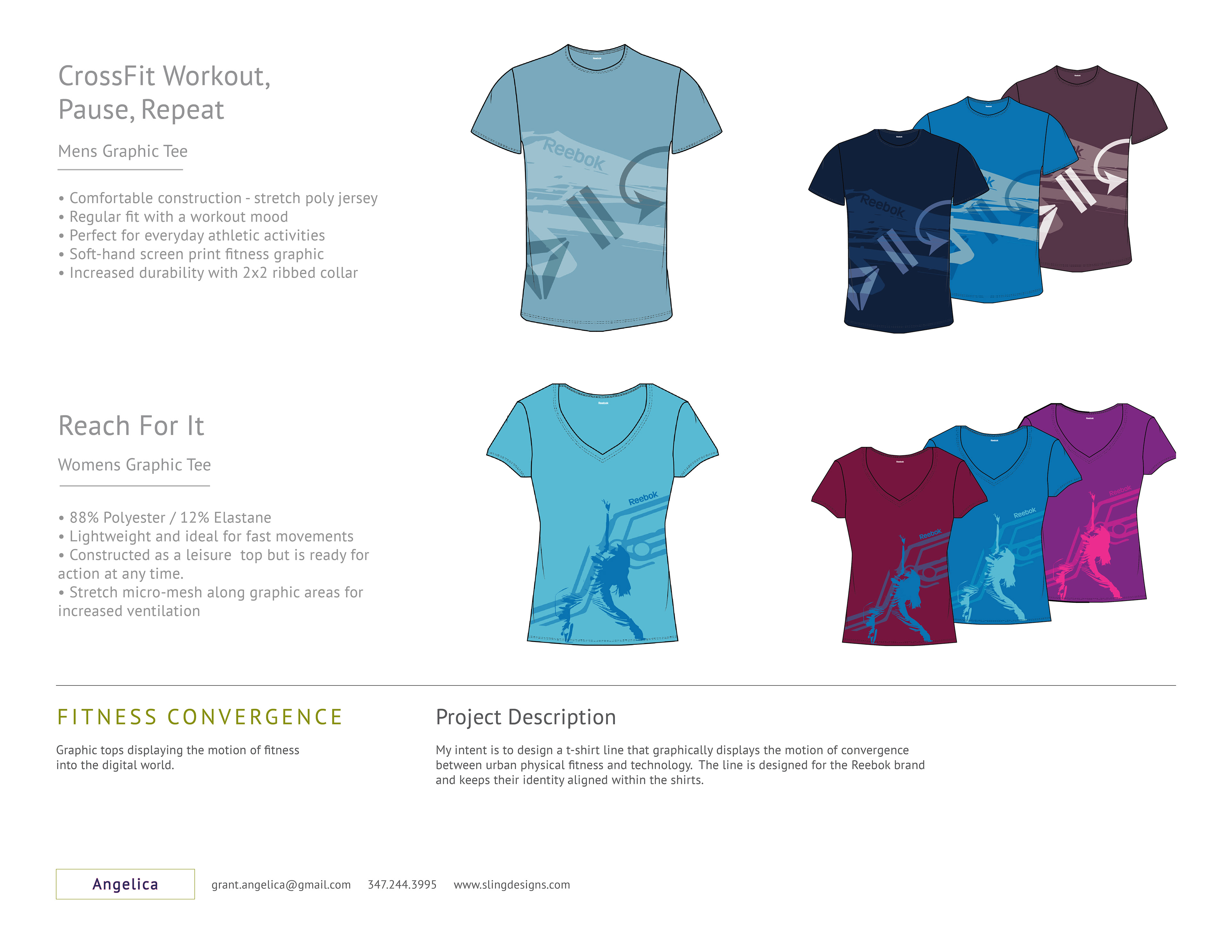 My intent is to design a t-shirt line that graphically displays the motion of convergence between urban physical fitness and technology. The line is designed for the Reebok brand and keeps their identity aligned within the shirts.