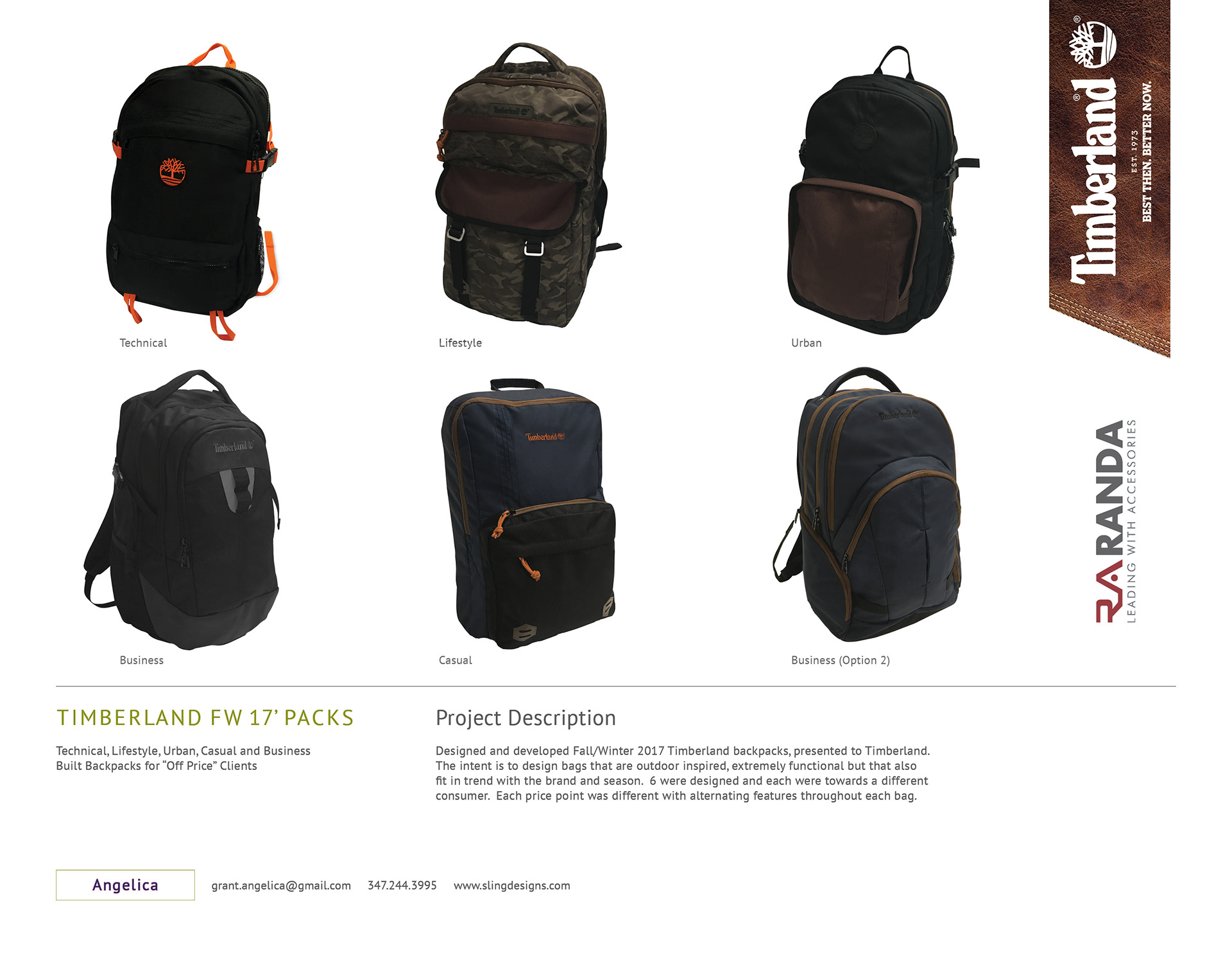Designed and developed Fall/Winter 2017 Timberland backpacks, presented to Timberland. The intent is to design bags that are outdoor inspired, extremely functional but that also fit in trend with the brand and season. 6 were designed and each were towards a different consumer. Each price point was different with alternating features throughout each bag.