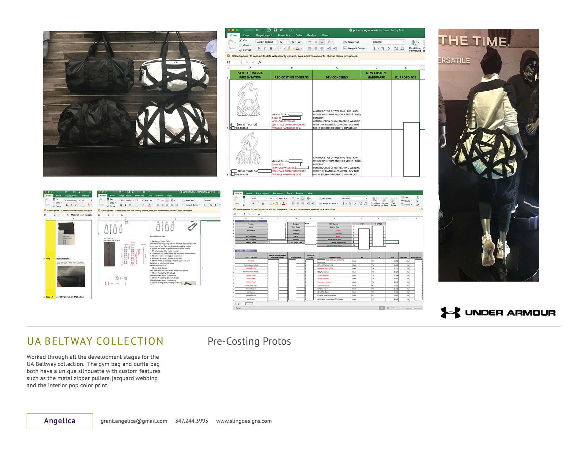 Developed the UA Beltway Bag Collection from concept stages to production. Hit margin targets by evaluating costing through each stage of the bag while also maintaining a custom design. Also focused on clear and concise techpack specs, managing the preparation of fabrics, developing all hardware through CADS and revising construction protos/overall functionality.